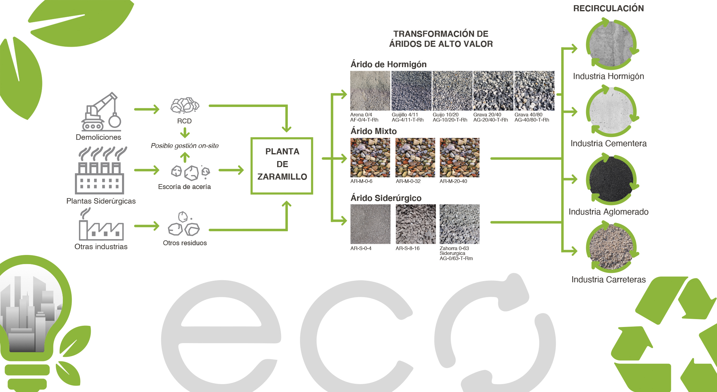 En nuestra planta ubicada en el Barrio Zaramillo de Güeñes recibimos los residuos de construcción y demolición procediendo en un primer paso del proceso a su clasificación en función de su naturaleza y composición tras su separación en origen: residuos de hormigón o residuos mixtos.
